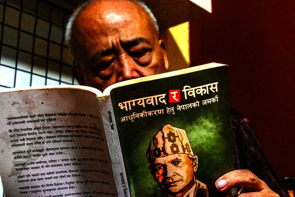 Since I can’t possibly be more stupid than one of my characters, today I confidently picked up Dor Bahadur Bista’s Fatalism and Development: Nepal’s Struggle for Modernization. Already, I’m halfway through, as proven by a most convincing photograph. This wasn’t easy, I tell you, since I had to guess at every word. I wasn’t even sure those squiggly lines were words.