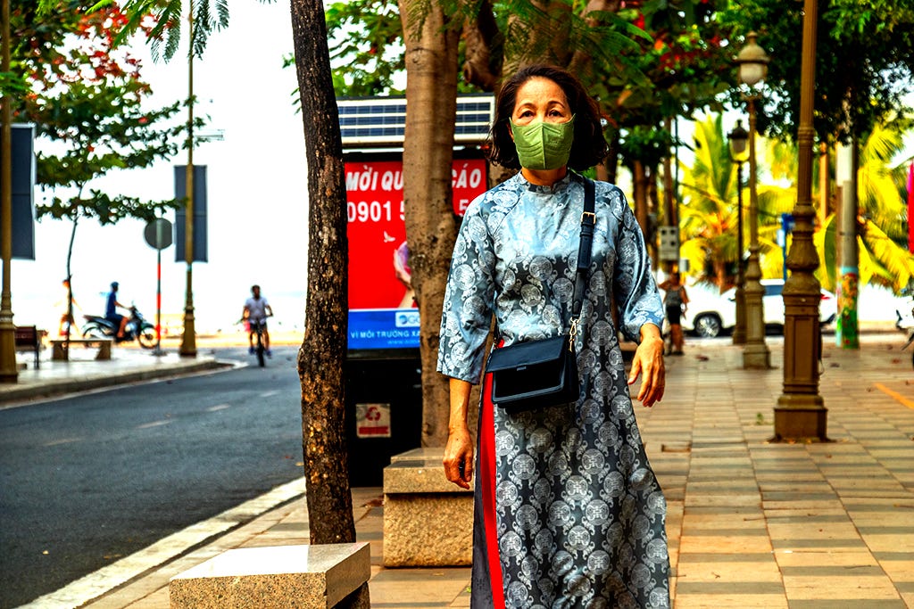 With the least detail, we don’t just betray ourselves as individuals, but indict or honor an entire society. Walking to Ten, I passed a masked woman in an áo dài. Within sight of the ocean, there’s no pollution. No one was near her. Barely breathing, she’s well schooled.